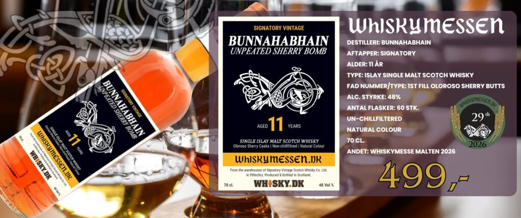 Bunnahabhain Unpeated Sherrybomb 11 år 48% er årets udvalgte sherrybombe til Whiskymessen Malten 2026 – en intens, mørk og kompromisløs Islay‑single malt uden røg, men med fuld kraft fra 1st Fill Oloroso sherry butts. En whisky, der viser præcis hvorfor Bunnahabhain er blandt de mest elskede destillerier, når det gælder tung, frugtdrevet sherrykarakter.